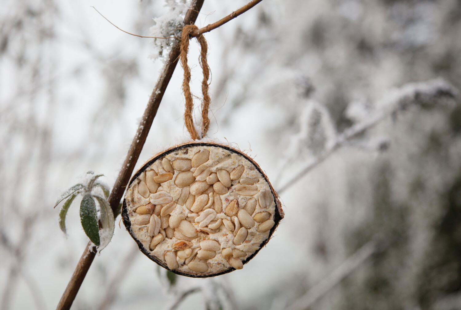 Een halve kokosnoot gevuld met pindanoten, ideaal als aanvullend voeder voor tuinvogels in de winter.