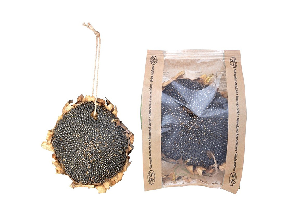 Een gedroogde zonnebloem van Esschert Design is een natuurlijke, kant-en-klare maaltijd voor vogels, boordevol voedingsstoffen en vitamines. De zonnebloempitten hebben een hoog vetgehalte, wat de vogels in je tuin de broodnodige energie geeft.