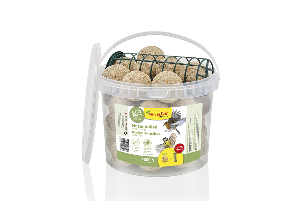Ecopack met 50 mezenbollen zonder netje. De lege netjes van mezenbollen komen al te vaak in onze tuinen terecht en zijn niet altijd veilig voor kleine tuinvogels. Met dit Ecopack help je mee aan een nettere omgeving en verklein je de afvalberg.