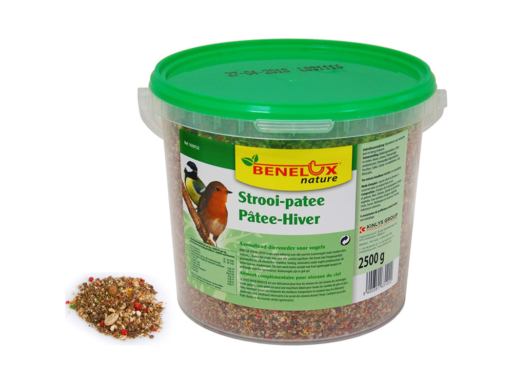 Dit vogelvoer is een ware lekkernij voor allerlei soorten tuinvogels zoals roodborstjes, meesjes, mussen, vinken,... Het is tevens het ideale voer voor alle soorten spechten. Strooipaté bevat zeer hoogwaardige voedingsstoffen zoals eiwitten en mineralen zodat vogels vol energie probleemloos de winter kunnen doorbrengen.