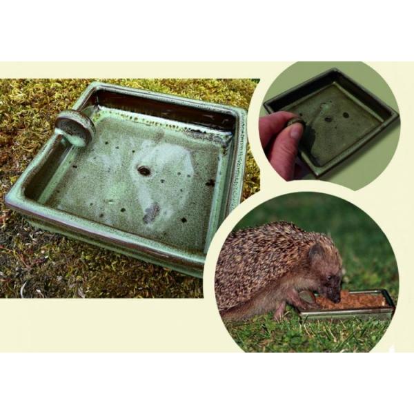 Een handige, hygiënische en gemakkelijk schoon te houden eetkom voor egels en andere kleine zoogdieren. Gemaakt van vorstbestendig keramiek in een aantrekkelijke groenbruin geglazuurde afwerking. De kom is voorzien van een drainagegat voor afvoer van het regenwater.