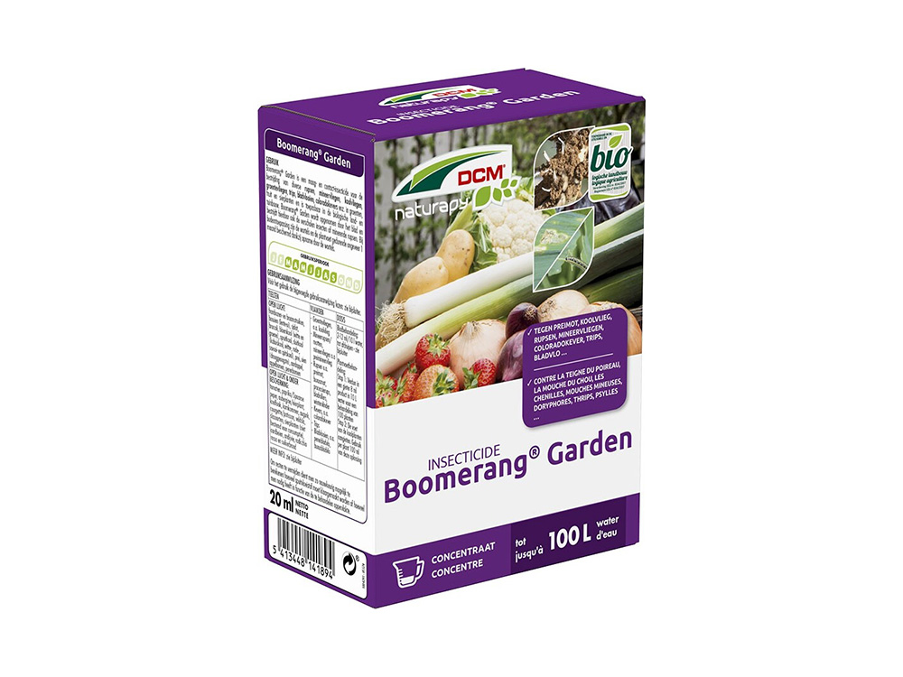 DCM Boomerang Garden is een maag- en contactinsecticide voor de bestrijding van preimot, koolvlieg, rupsen, mineervliegen, coloradokever, trips, bladvlo … in groenten en fruit.