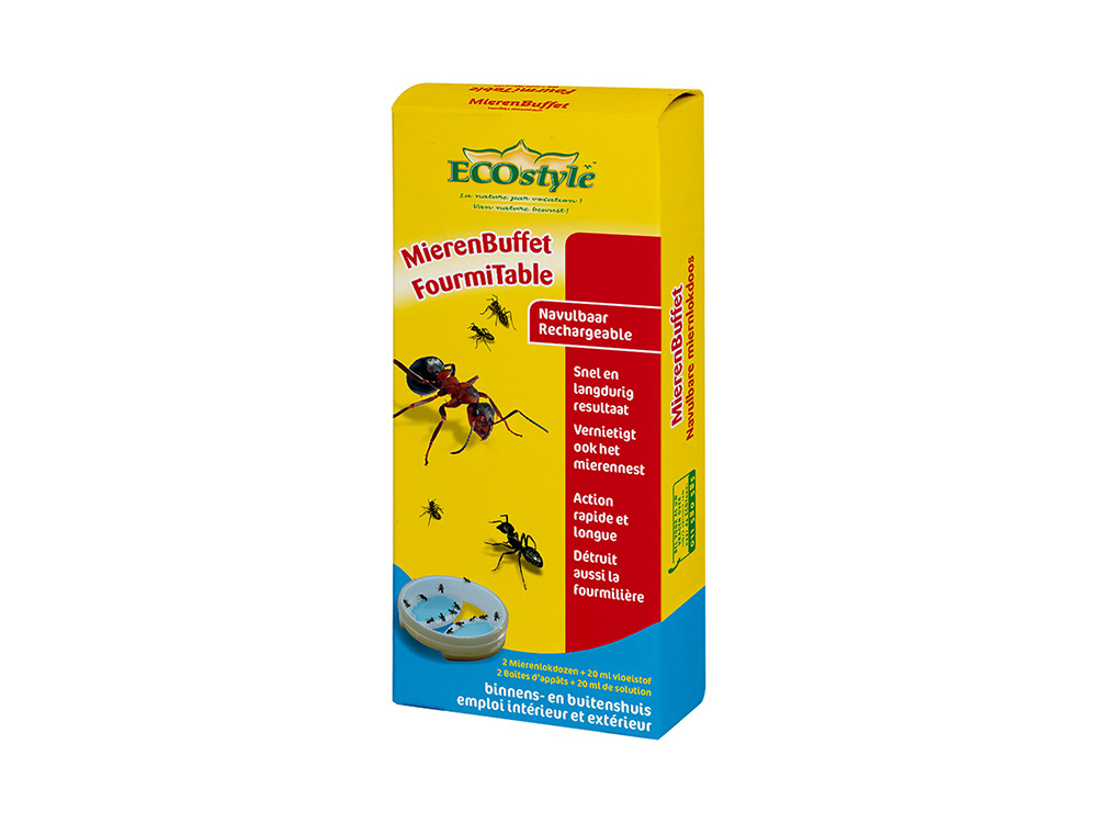Het mierenbuffet bestaat uit twee navulbare mierenlokdoosjes voor bestrijding van mieren in huis, op terras en balkon.