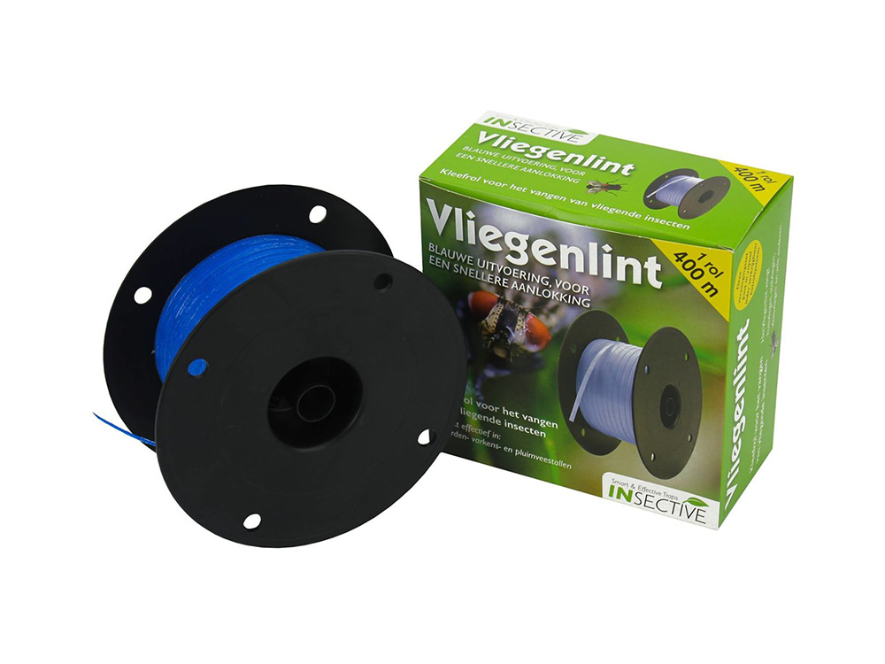 Gifvrij vliegenlint voor het vangen van vliegen in stallen, melklokalen, schuren,... Deze rol heeft een blauw lint om meer aantrekkingskracht uit te oefenen op vliegen.