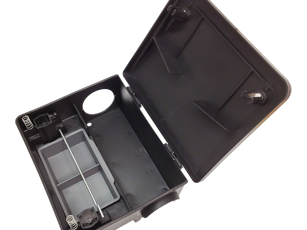 Met de bijgeleverde sleutel open je de box en binnenin tref je een uitneembaar schaaltje voor lokaasgraan of pasta en een metalen spie om rattengifblokjes aan te bevestigen.