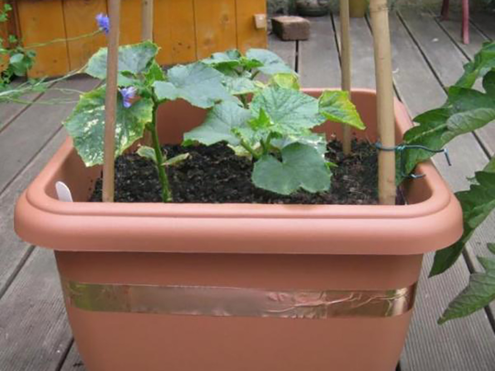- Bevestig de zelfklevende kopertape rondom een bloempot, kuip, ...