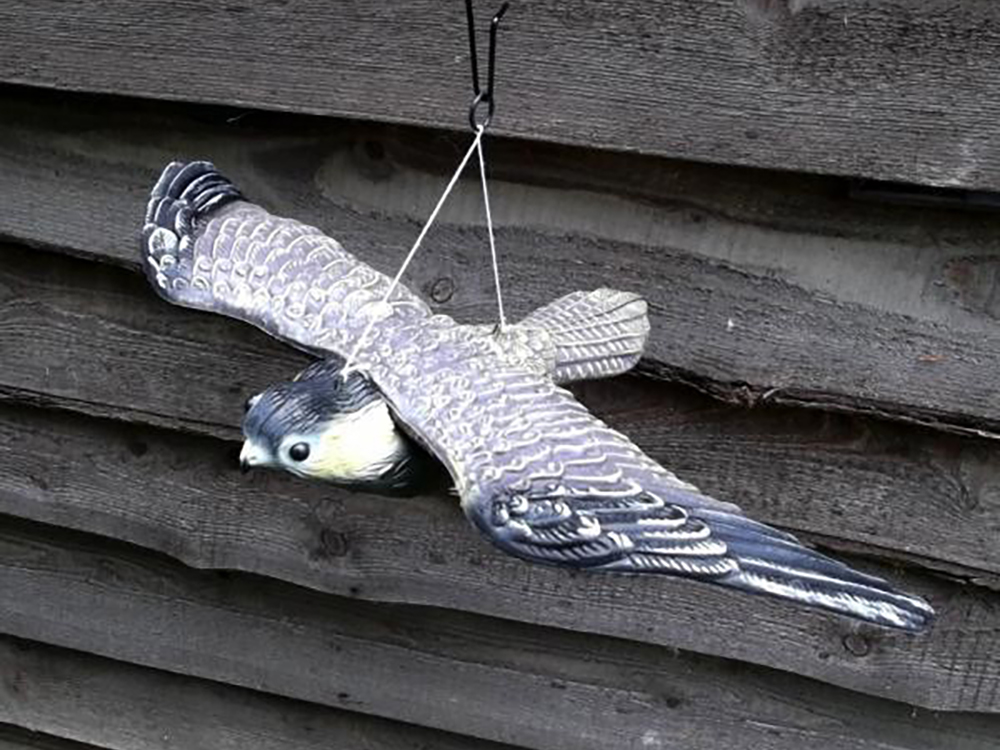 Levensgrote slechtvalk in volle vlucht als afschrikmiddel voor duiven en spreeuwen, maar ook andere vogels bij boomgaarden, nieuw gezaaide gazons, vijvers, groentetuinen en balkons.
