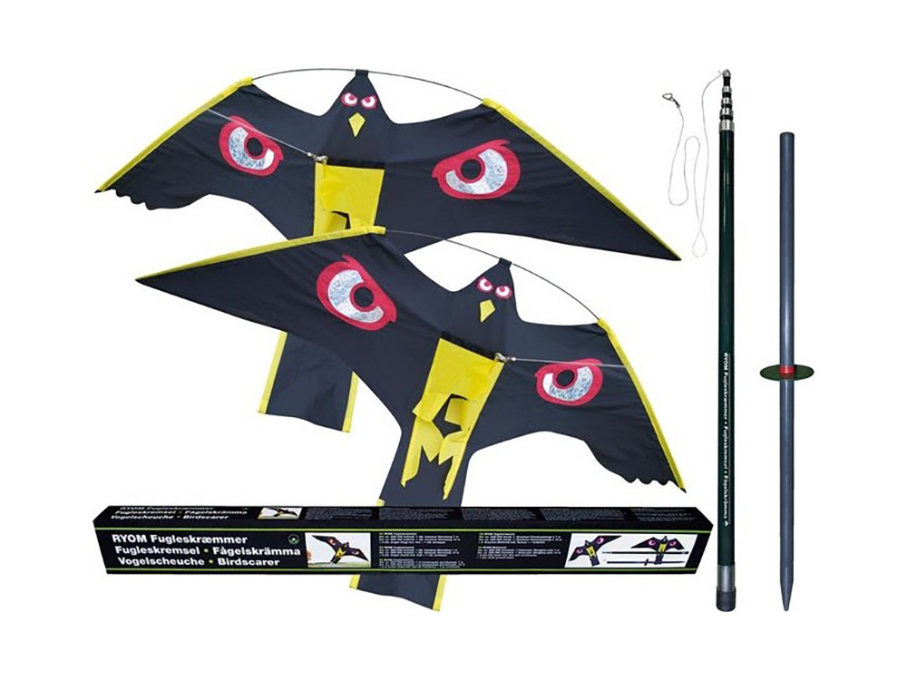 De grote zwarte vogels zijn voorzien van afschrikwekkend grote, rode reflecterende ogen. De Kite Hawk wordt geleverd met een stevige telescopische paal in glasvezel van 10 meter waaraan je de vogels vast maakt. Er wordt ook een grondanker meegeleverd. Dit maakt de Kite Hawk ideaal voor het beschermen van gewassen, boomgaarden, pas gezaaide gazons, vijvers,...