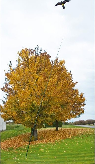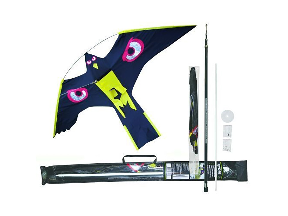 De grote zwarte vogels zijn voorzien van afschrikwekkend grote, rode en reflecterende ogen. De Kite Hawk wordt geleverd met een stevige telescopische paal in glasvezel van 4 meter waaraan je de vogel vast maakt. Er wordt ook een grondanker meegeleverd. Dit maakt de Kite Hawk ideaal voor het beschermen van o.a. gewassen, boomgaarden, pas gezaaide gazons, vijvers,...