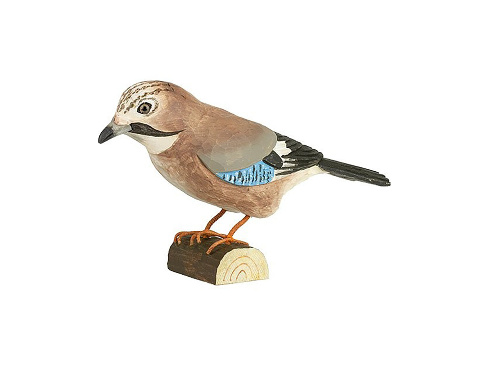 Ambachtelijk vormgegeven houten gaai (Garrulus glandarius). De gaai wordt op ware grootte weergegeven en is beschilderd met milieuvriendelijke verf.