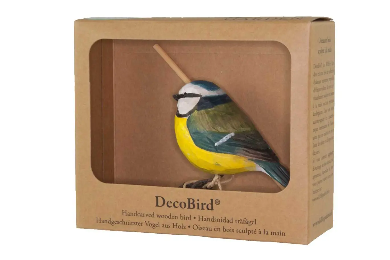 Ambachtelijk vormgegeven houten pimpelmees. De pimpelmees wordt op ware grootte weergegeven en is beschilderd met milieuvriendelijke verf.