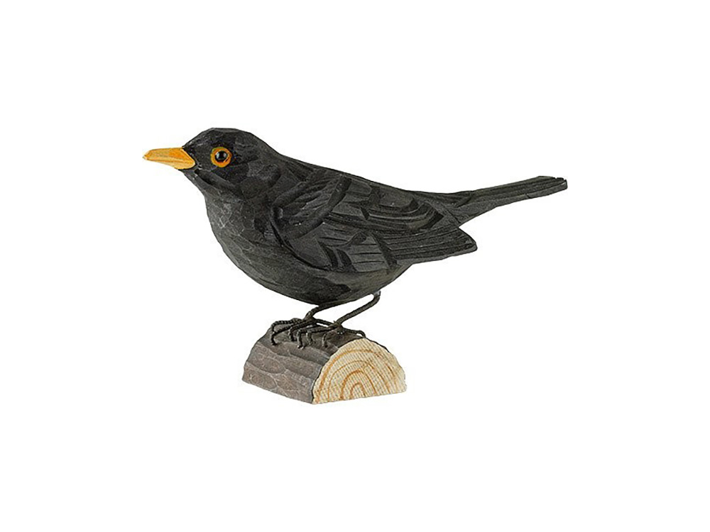 Ambachtelijk vormgegeven houten merel. De merel is op ware grootte weergegeven en beschilderd met milieuvriendelijke verf. Het beeldje wordt geleverd met een stokje waarmee de vogel ter decoratie in een bloempot gestoken kan worden.