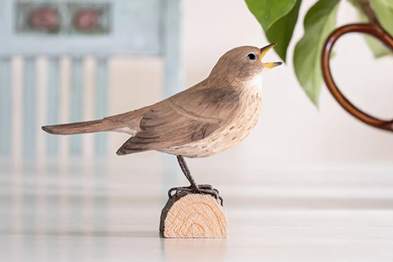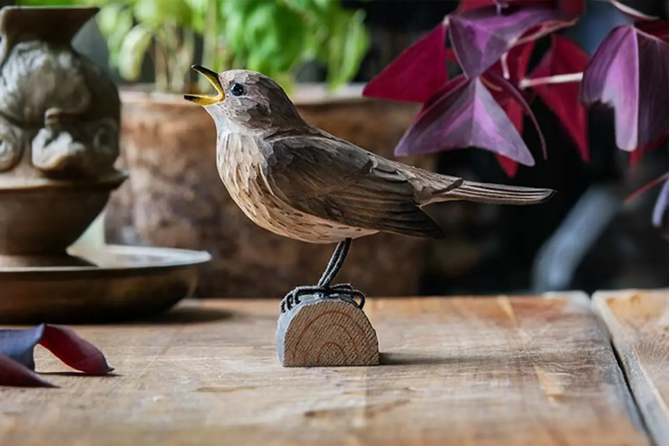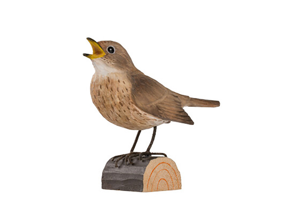 Ambachtelijk vormgegeven houten nachtegaal (Luscinia megarhynchos). De nachtegaal wordt op ware grootte weergegeven en is beschilderd met milieuvriendelijke verf.