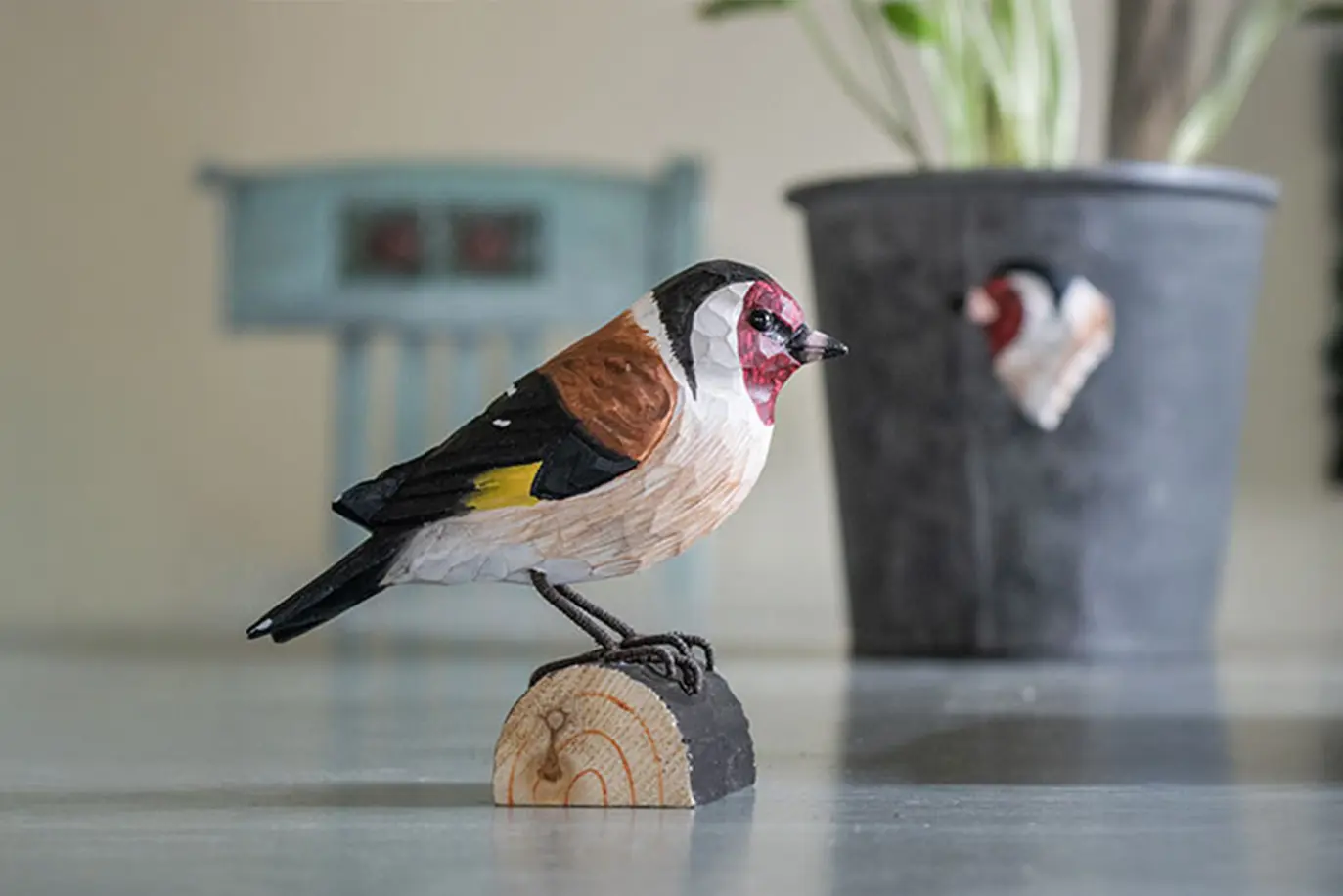 Ambachtelijk vormgegeven houten distelvink of putter. De distelvink wordt op ware grootte weergegeven en is beschilderd met milieuvriendelijke verf. Het beeldje wordt geleverd met een stokje waarmee de vogel ter decoratie in een bloempot gestoken kan worden.