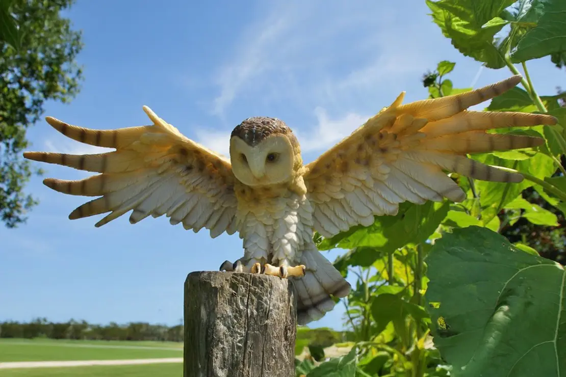 Prachtige decoratie van een kerkuil met open vleugels. De uil spreidt zijn vleugels uit om te landen of om zijn prooi te vangen. Dit muurbeeld is uniek en prachtig afgewerkt tot in detail: de pluimen, ogen, poten en kleuren van de uil vormen een waarheidsgetrouwe weergave van deze prachtige vogel.