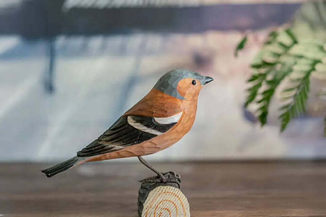 Ambachtelijk vormgegeven houten vink. De vink wordt op ware grootte weergegeven en is beschilderd met milieuvriendelijke verf.