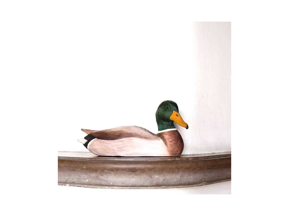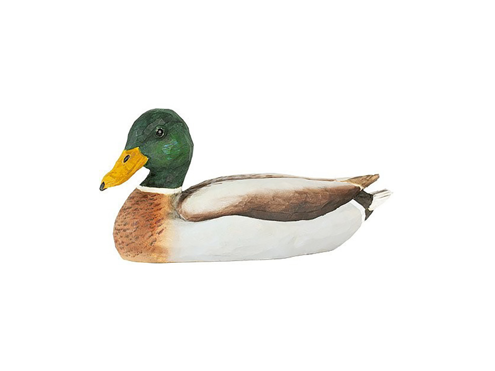 De wilde eend is een veel voorkomende watervogel die je voortaan ook in het hout in de tuin of in de woonkamer kan plaatsen. Met zijn groene kop en gele snavel is dit houten beeld een streling voor het oog.