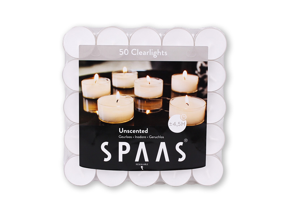 Een set geurloze theelichtjes in transparante cups. Doorheen de cups zie je de paraffine langzaam veranderen in een heldere vloeistof.