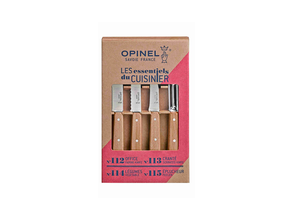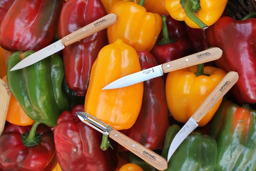 Leuke en complete set van drie kleine keukenmessen en dunschiller van het gerennomeerde merk Opinel. Het gewone keukenmesje en de dunschiller zijn onmisbaar in de keuken.
