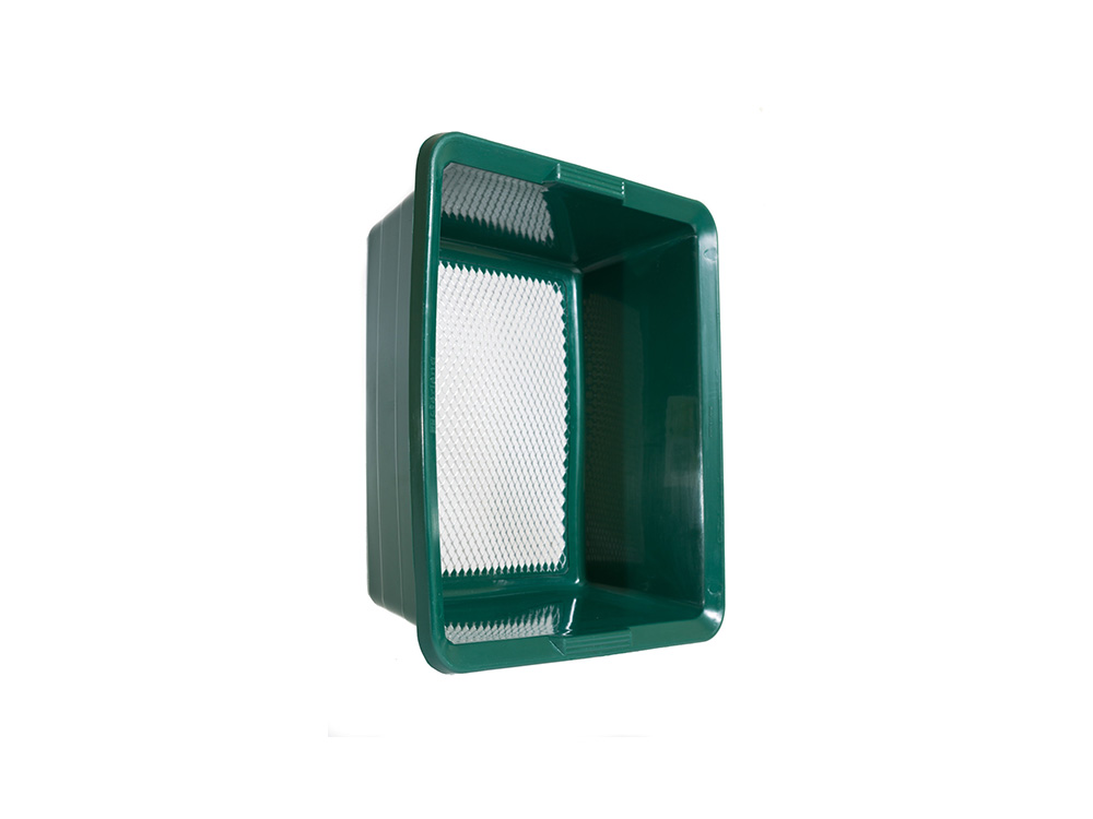 Diepe kunststoffen zeef met een verzinkt stalen raster met ruitvormige fijne mazen van 9 x 5 mm. Ideaal voor het zeven van compost, potgrond, zaai- en stekgrond,...