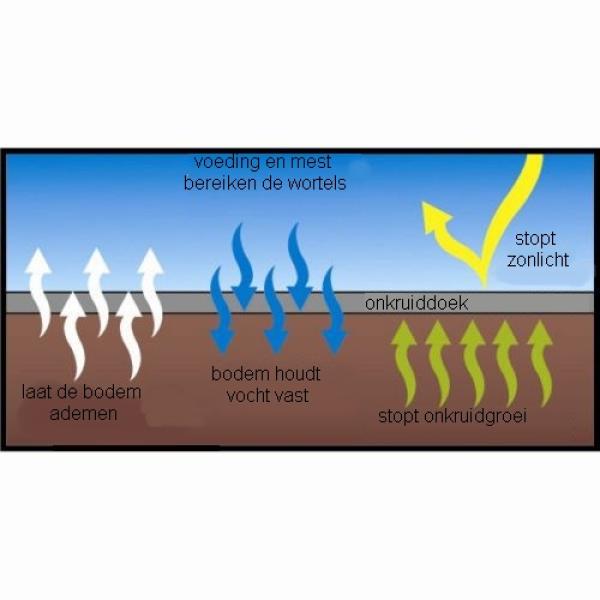 Het doek zorgt ervoor dat er geen onkruid te voorschijn komt tussen de gewassen. Eenvoudig aan te wenden voor vele teelten of borders, geschikt voor allerlei planten, bloemen en groenten. Bijvoorbeeld bij het aanplanten van heggen, struiken en bomen, bloemborders, aardbeibedden, rotstuintjes,...