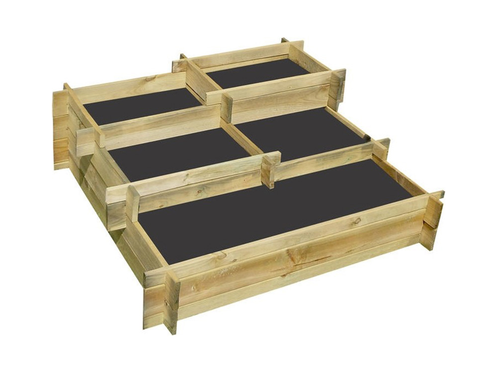 Degelijke houten moestuinbak in trapvorm die ook als bloembak kan gebruikt worden. Deze gestapelde bak in grenenhout heeft vier verschillende plantniveaus. Angelic is opgebouwd uit het eenvoudige systeem van houtstapelbouw en wordt geleverd met een beschermend gronddoek.