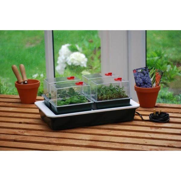 Kweek bloemen, groenten of kruiden binnenshuis met deze vierdelige propagator. De elektrisch verwarmde zaaibak is voorzien van een 8 watt verwarmde bodem waardoor de bodemtemperatuur ca. 8° C wordt opgewarmd, ideaal voor een snellere kieming en groei van zaaigoed of het bewortelen van stekken. Dit unieke model stelt je in staat meerdere soorten te kweken in 4 afzonderlijk geventileerde kweekkasjes.