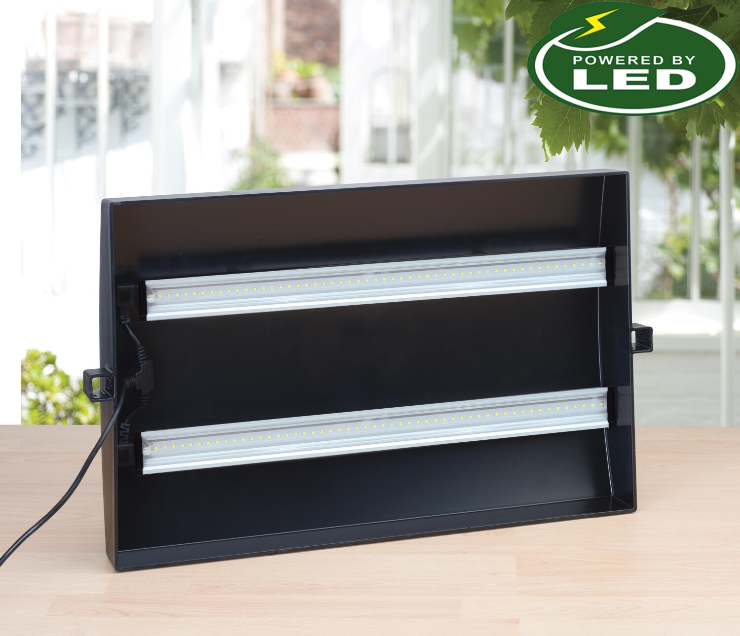 De ingebouwde Sunblaster ledstrips bieden een heldere en energiezuinige volle groeilichtspectrumverlichting dat speciaal is gericht op een optimale plantengroei. De overkapping waarin de lampen zich bevinden is volledig in hoogte verstelbaar via de aluminium staanders, waardoor een maximale vrije hoogte ontstaat van 38 cm vanaf de onderkant van de basisbak.