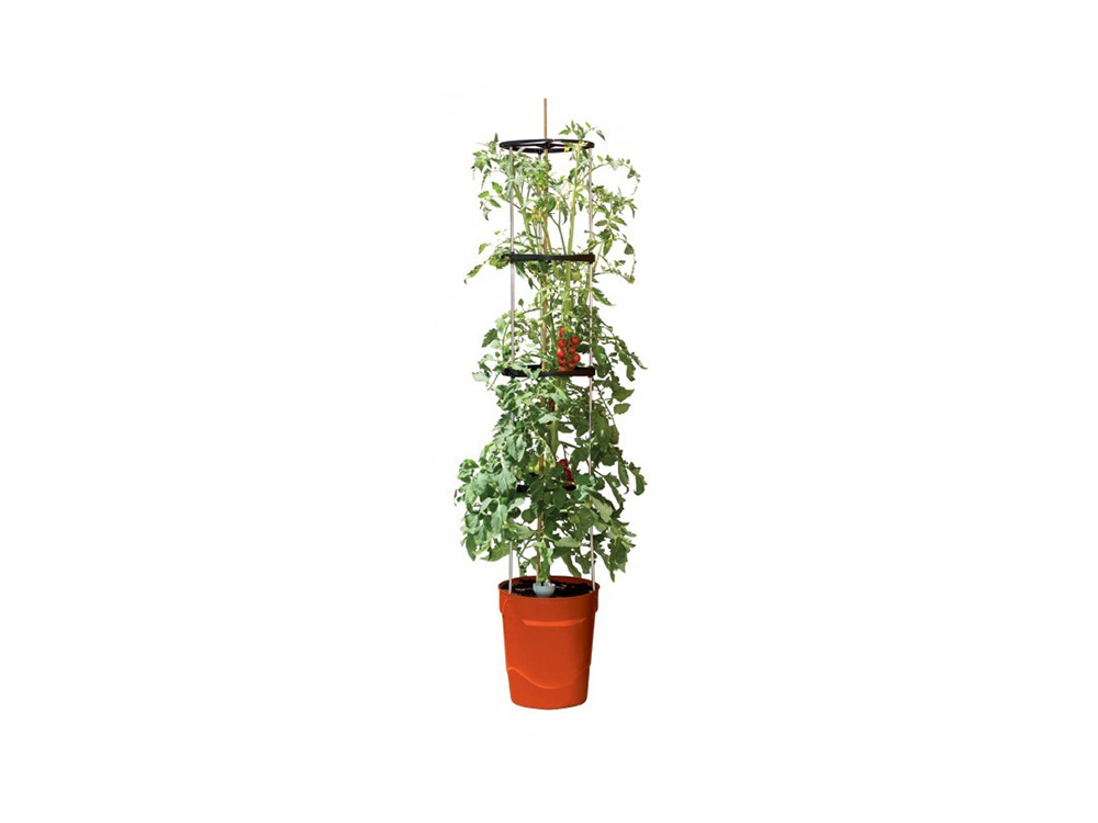 De pot is voorzien van een stevige, 150 cm hoge plantondersteuning bestaande uit vier ringen en aluminium geleiders. De toren met 4 niveaus zorgt voor een perfecte groei.