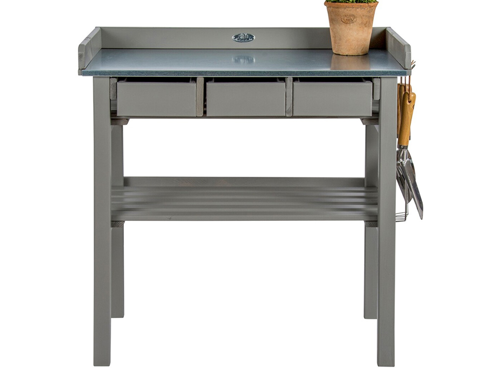 Onder het verzinkte werkblad zijn drie lades beschikbaar voor het opbergen van tuinspullen zoals een snoeischaar of een plantenschop, zodat je altijd alles bij de hand hebt tijdens het tuinieren. Daaronder bevindt zich nog een legplank voor bloempotten, potgrond en andere benodigdheden.