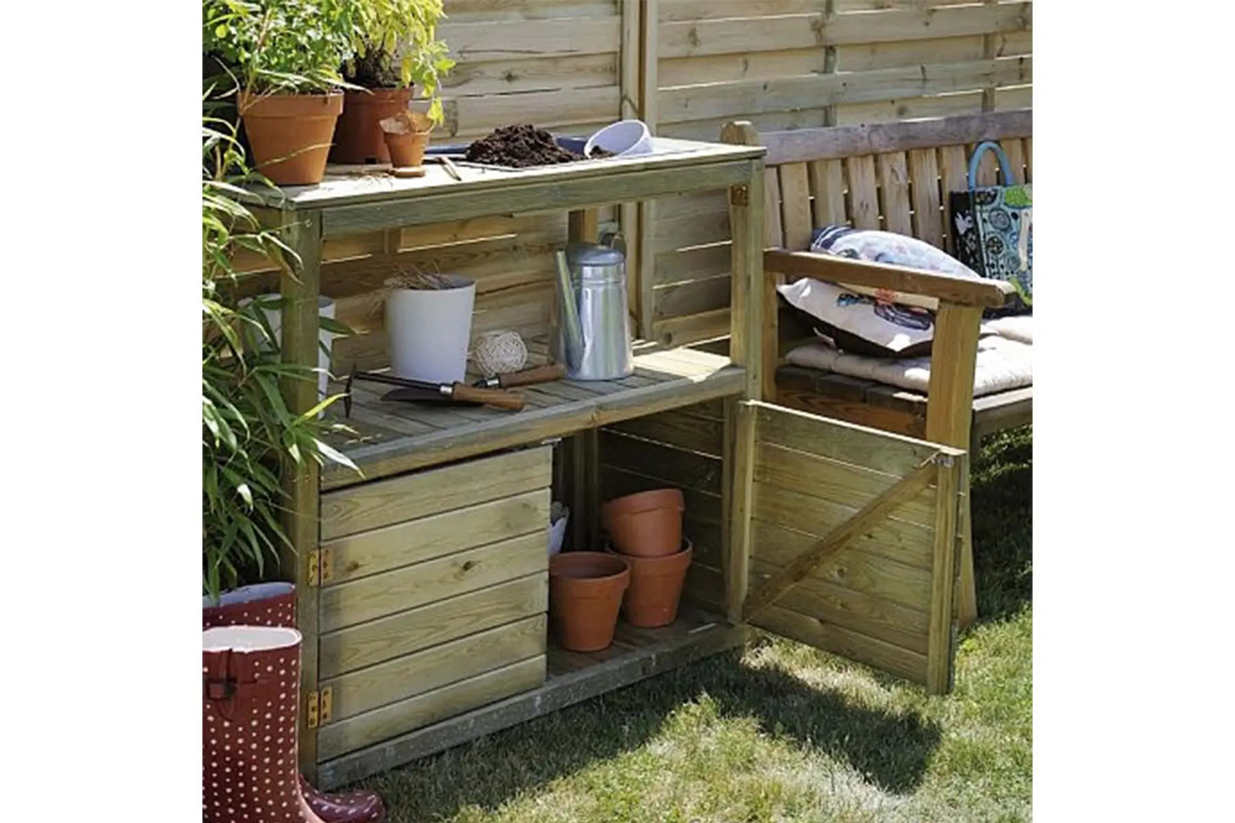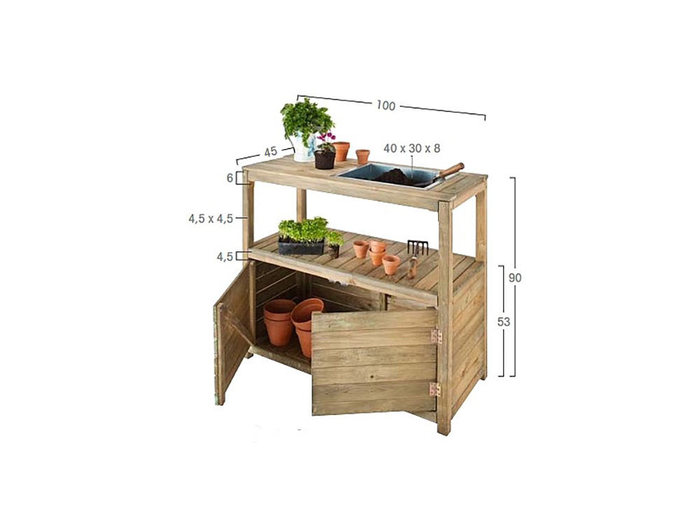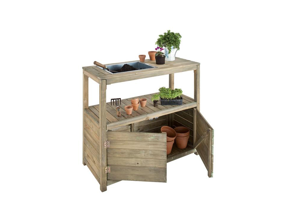 Grenenhouten oppottafel met handige opbergkast. Deze mooie werktafel heeft een verzinkte werkbak en is gemaakt uit duurzaam geïmpregneerd grenenhout.