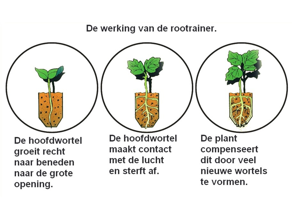 Het principe is eenvoudig. In de diepe cel komt de hoofdwortel snel aan het grote drainegegat op de bodem en sterft af. Hierdoor reageert de zaailing en maakt hij tal van zijwortels aan die op hun beurt mooi naar beneden worden geleid door de groeven in de celwanden. Dit kan je mooi zien wanneer je de celmodules openvouwt.