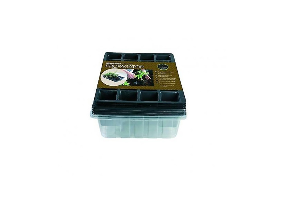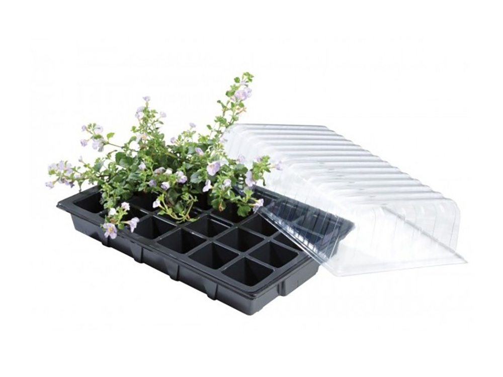 Drie kunststof kweeksets met 24 zaai- of stekcellen. Eén kweekset uit gerecycleerd kunststof bestaat uit drie onderdelen: de zaaitray van 24 cellen, een onderschaal voor water en een transparant koepeldeksel.