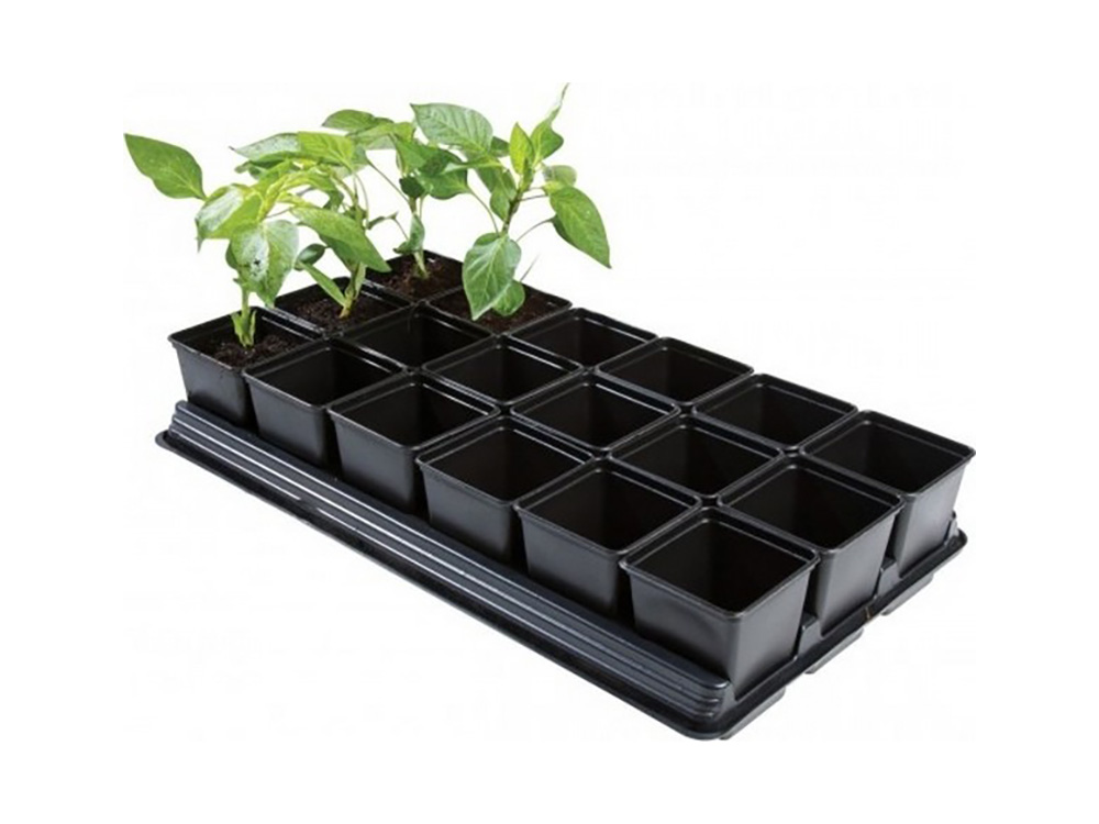 Deze professionele kweekset bestaat uit 18 aparte vierkante potten van 9 cm die passen in de voorgevormde onderschaal. Hierdoor staan ze zeer stabiel staan en kunnen ze niet omvallen.