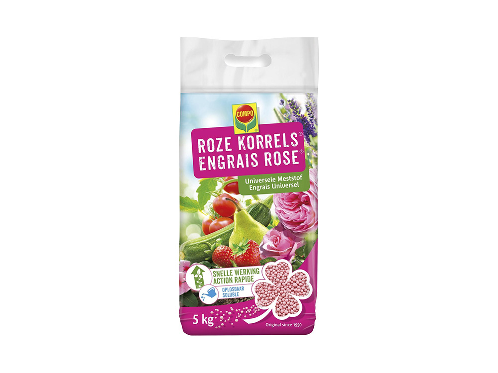 Roze korrels van Compo met een rijke samenstelling voor de bemesting van de ganse tuin: groenten, fruitbomen, perkplanten, struiken, sierplanten, coniferen, hagen...