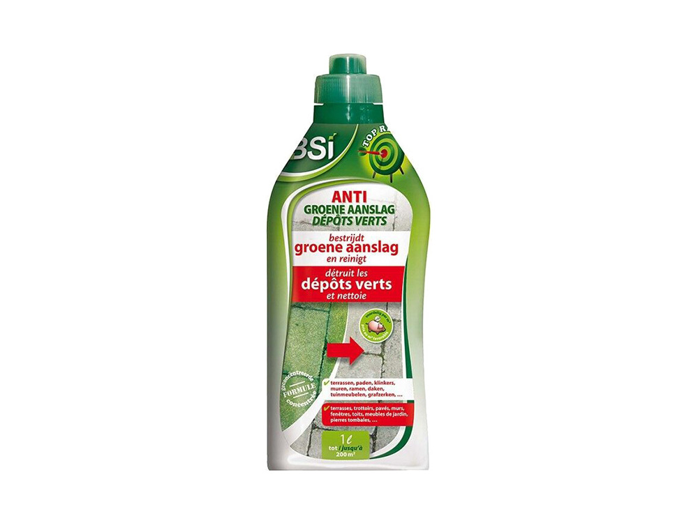 Ecologisch verantwoorde groenaanslagbestrijding met BSI Anti-groene aanslag voor toepassingen op verharde terreinen zoals de oprit, terras, paden, klinkers, muren... maar ook daken, tuinmeubelen, grafzerken etc.! Groene algen of aanslag maken paden en terrassen gevaarlijk glad bij nat weer. Oppervlakken met algenaanslag houden langer water vast met mogelijk blijvende schade tot gevolg. Deze anti-groene aanslag concentraat verwijdert groene algen zonder problemen.