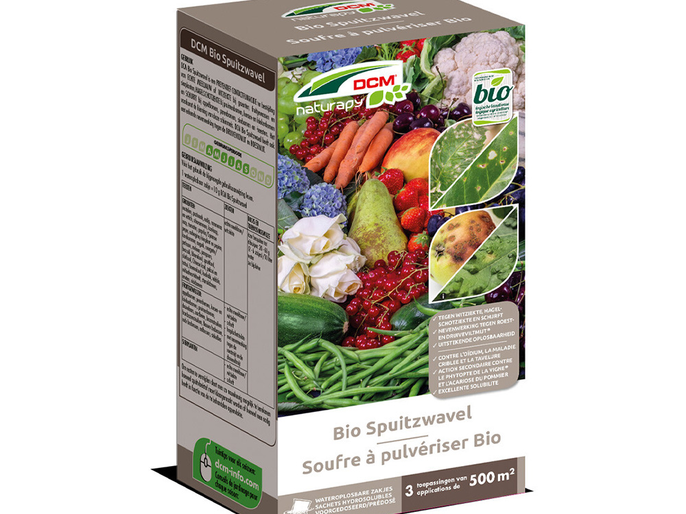 DCM spuitzwavel Bio, een preventief contactfungicide ter bestrijding van echte meeldauw of witziekte, hagelschotziekte en schurft.
