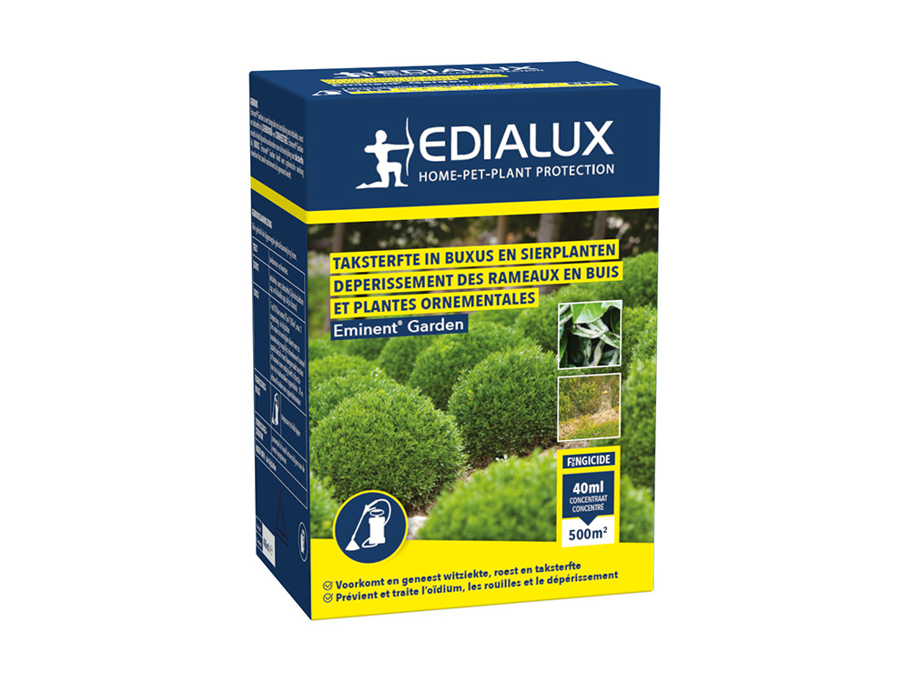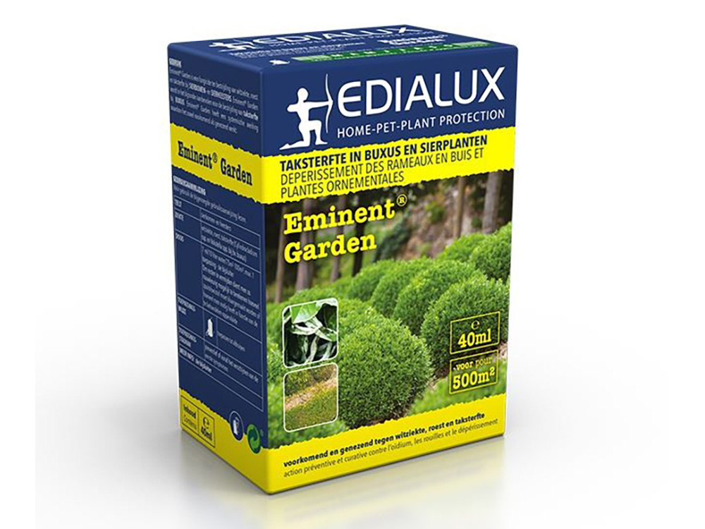 Eminent Garden, speciaal aanbevolen bij behandeling van buxusschimmels (Volutella buxi en Cylindrocladium buxicola). Ter voorkoming en ter bestrijding van schimmelziekten in sierbomen en - heesters. Speciaal aanbevolen voor de schimmelproblemen bij buxus. (Volutella buxi en Cylindrocladium buxicola).