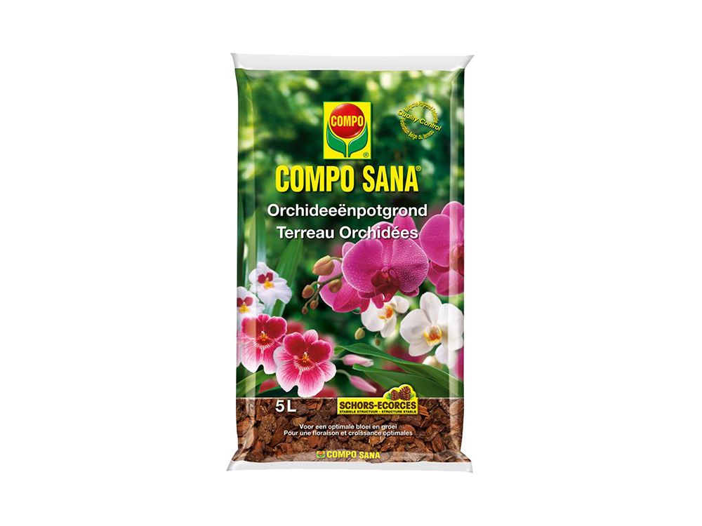 De Compo Sana potgrond voor orchideeën zorgt voor een krachtige groei en een prachtige bloei bij het aanplanten of verpotten van alle soorten orchideeën. De potgrond bestaat uit zeedenschors (Pinus Maritima), bonkveen, meststof op basis van calcium en/of magnesium en meststof, met een langdurige werking tot 100 dagen.