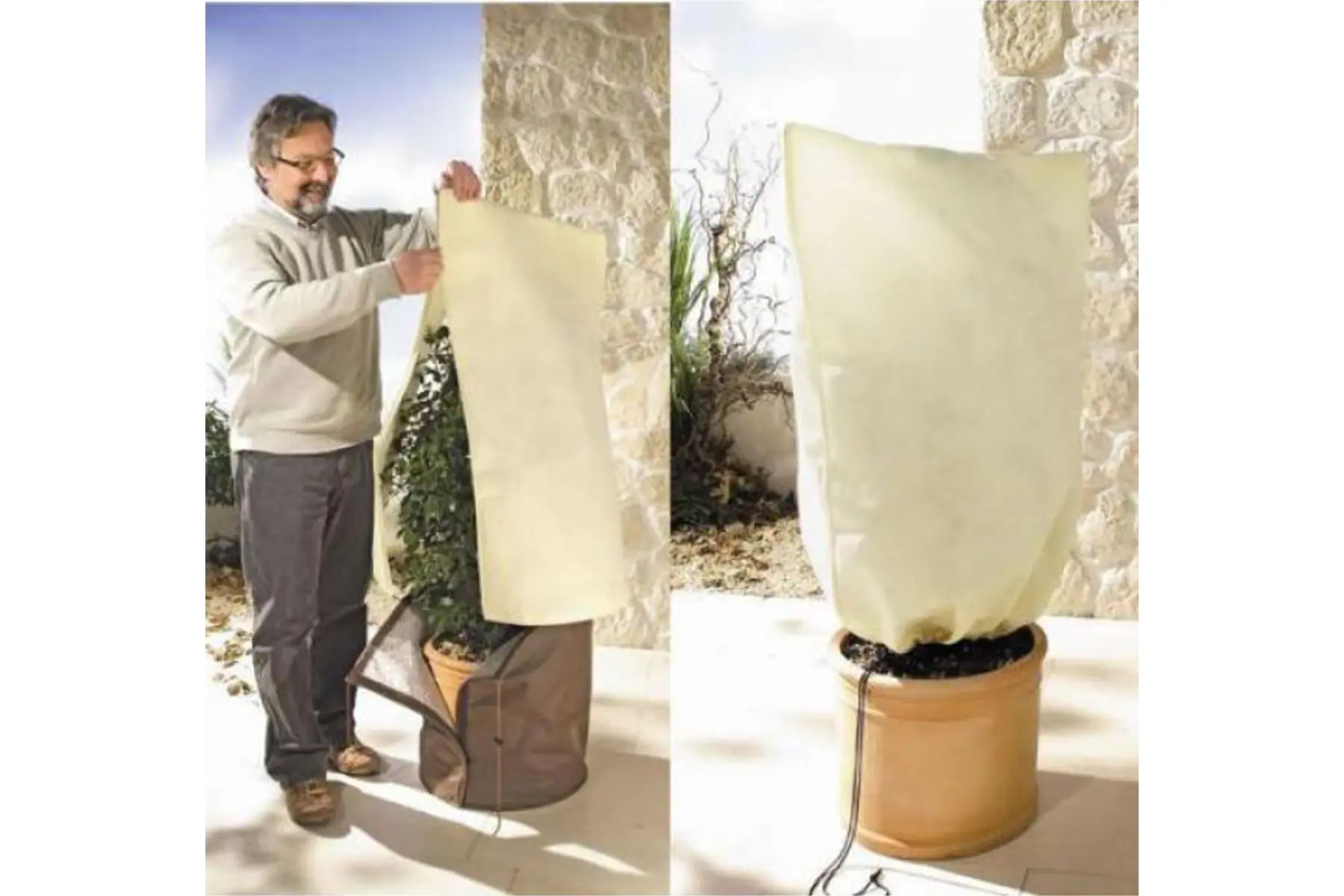 De beschermhoes is voorzien van een rits waardoor je de planten snel kan inpakken, controleren en terug kan uitpakken. Met de voorziene trekkoord kan je de hoes stevig rond de pot aanspannen. Dankzij de rits en de trekkoorden zit de thermohoes als gegoten rond jouw planten zodat hevige wind er (bij het correct aanbrengen) praktisch geen vat op kan krijgen. Bij gewone vliesdoeken is dit tot ieders frustratie vaak wel het geval.