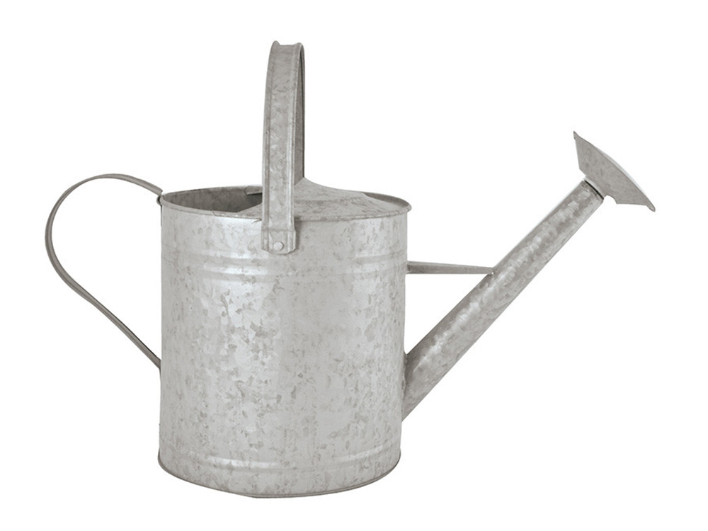 Authentieke zinken gieter met een ronde broes en een nostalgisch uiterlijk. De gieter heeft twee handgrepen, een scharnierende greep bovenop de gietteut en een greep aan de achterzijde.