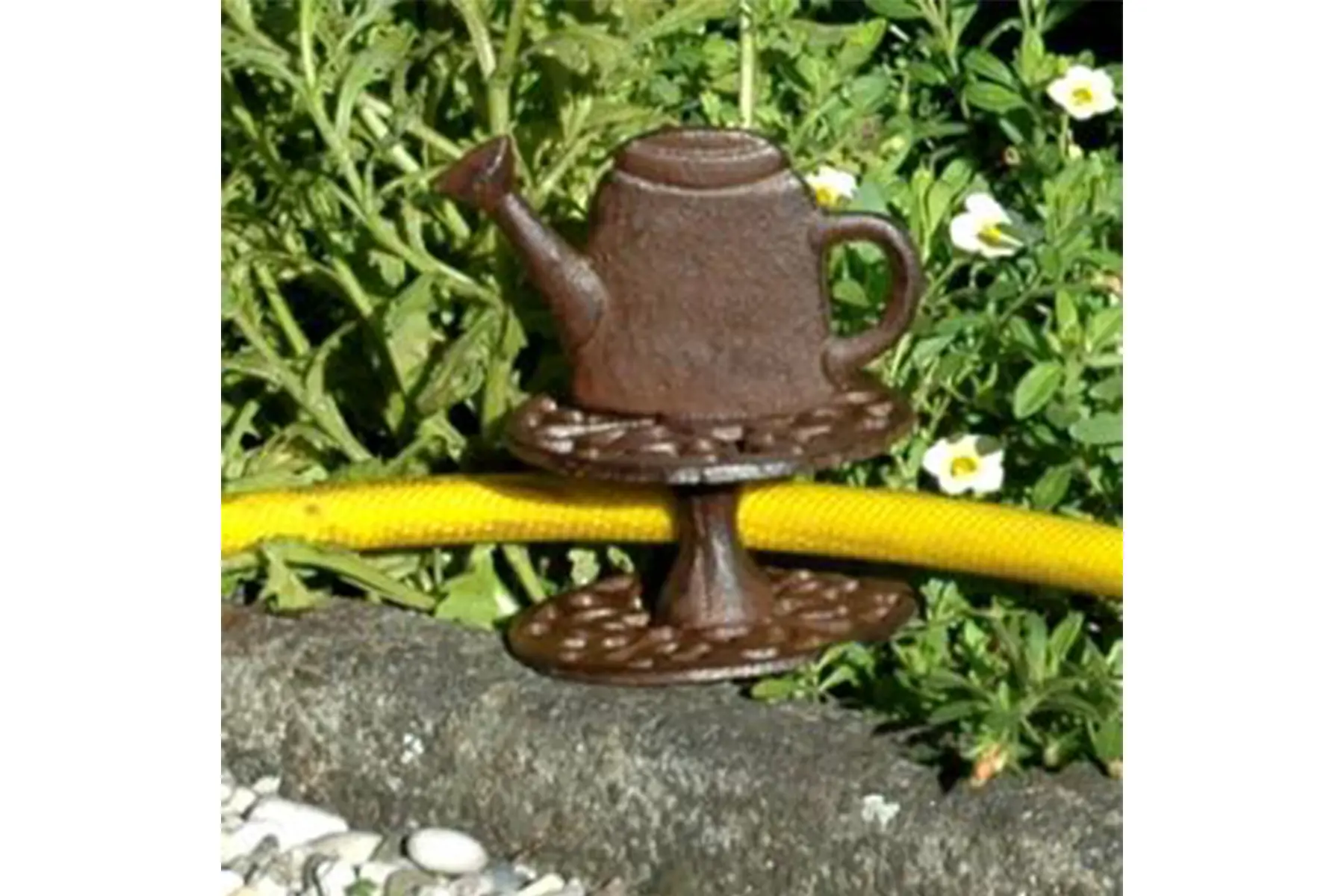 Antiekbruine gietijzeren tuinslanggeleider met decoratieve gieter bovenop. Dankzij deze stijlvolle tuinslanggeleiders trek je de tuinslang bij het gieten niet langer doorheen de plantenborders, maar glijdt ze netjes langs de geleider en volgen ze de gewenste route. Bij hoeken van paden of muren beweegt de tuinslang soepel langs de geleiders.