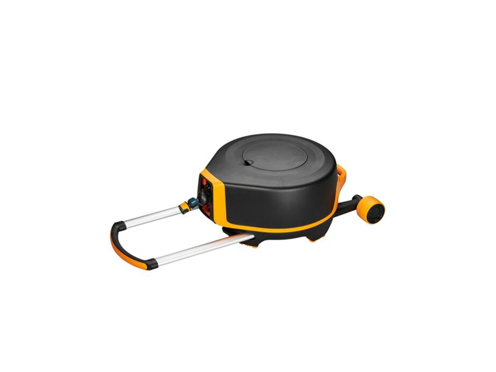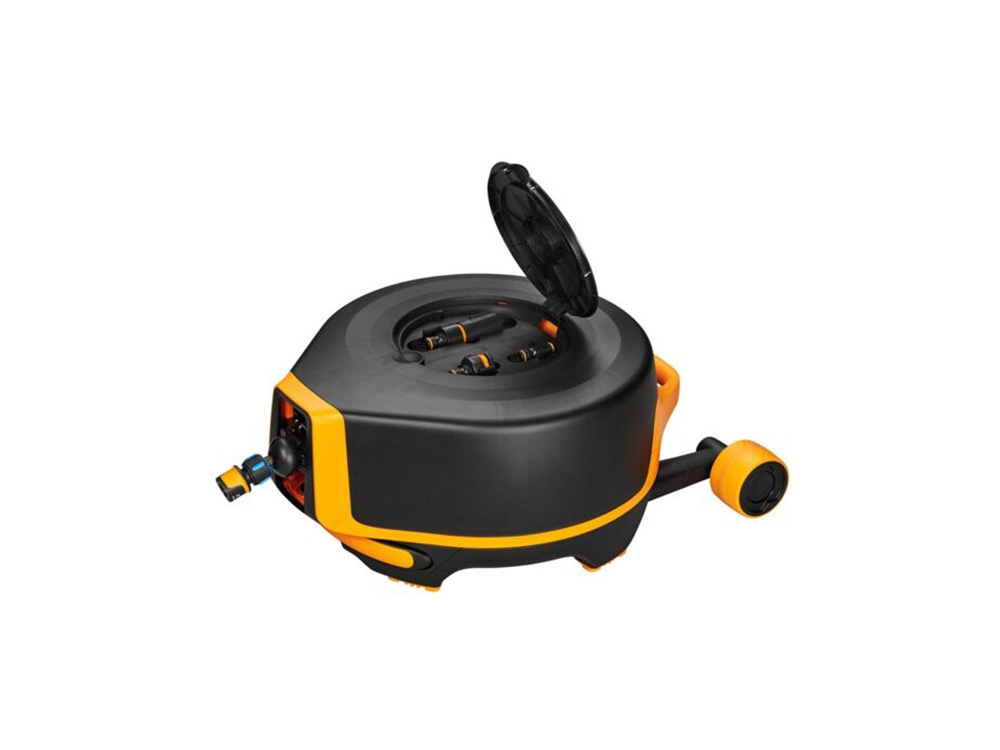 De 20 meter lange tuinslang (13 mm - 1/2') heeft een automatische oprolfunctie, de meegeleverde accessoires kunnen handig in de haspel worden opgeborgen.