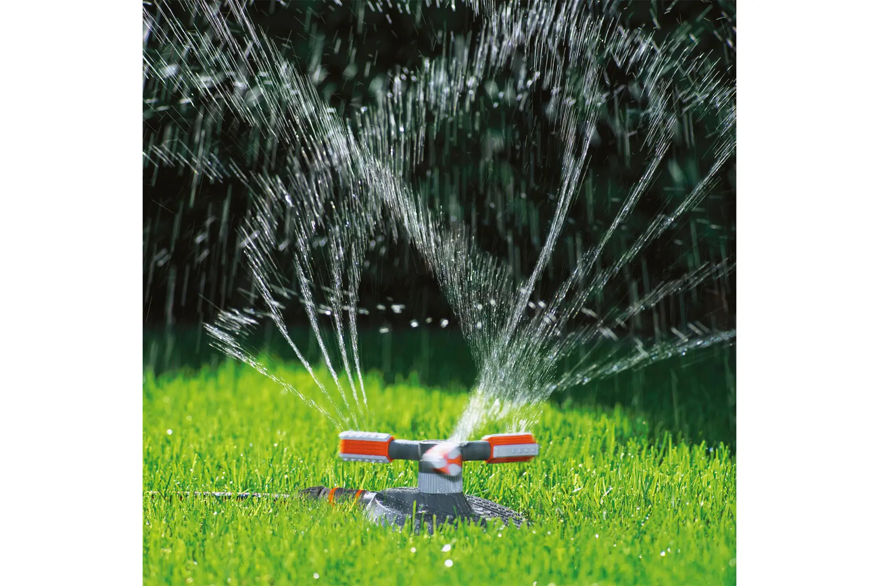 De sproeier heeft draaiende, zeer precieze spuitmonden voor gelijkmatige besproeiing zonder plassen. Het bereik van de sproeier kan afzonderlijk worden ingesteld door de watertoevoersnelheid aan te passen. De stevige basis garandeert een stabiele werking, maar kan ook mobiel worden gebruikt. Het fijnmazige, uitneembare vuilfilter maakt het reinigen heel eenvoudig.