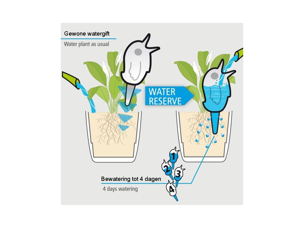 Prik de terracotta prikker in de potgrond van jouw kamer- of potplant en vul het kunststof waterreservoir met water via het vogelbekje. Het water wordt langzaam aan de potgrond vrijgegeven en voorziet op die manier jouw planten tot 4 dagen van water. Het vogeltje is transparant waardoor je makkelijk ziet wanneer je water bij kan geven.
