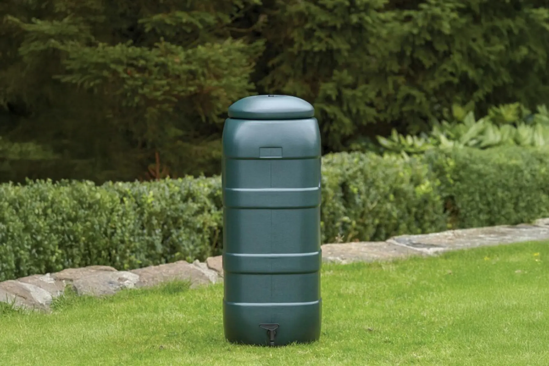 De ton is gemaakt uit duurzaam, kunststof en gaat door het donkergroene kleur helemaal op met de rest van de tuin.