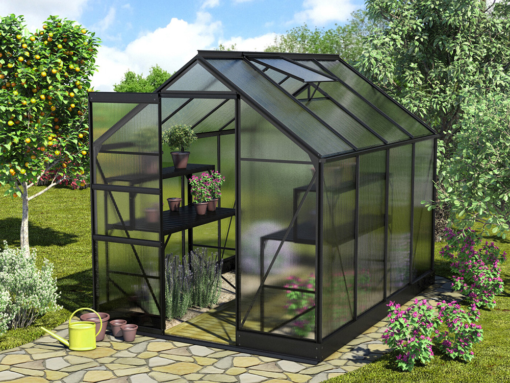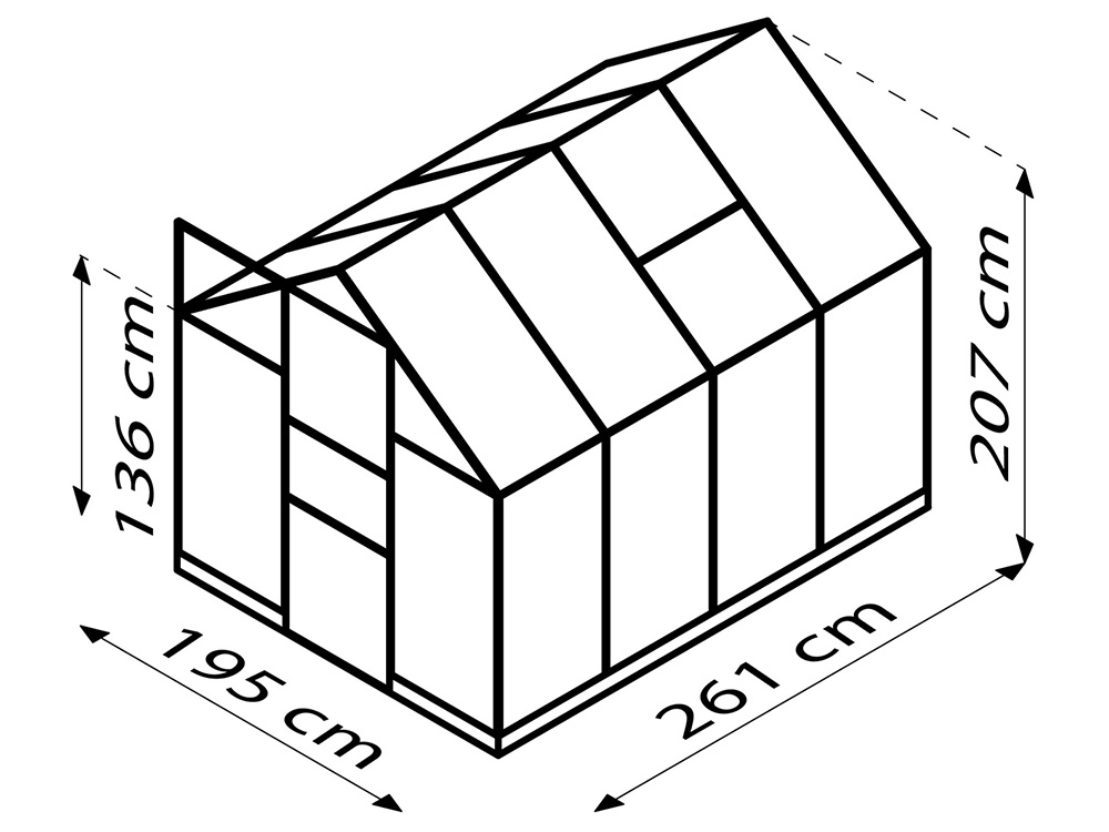 Het stevige frame is vervaardigd uit zwart poedergecoat aluminium, wat zorgt voor een luxueuze uitstraling. De schuifdeur, met een breedte van 61 cm, kan zo worden gemonteerd dat ze zowel naar links als naar rechts kan openen. Daarnaast is de kas uitgerust met geïntegreerde dakgoten en een fundering die zorgt voor een solide en stabiele verbinding met het frame.