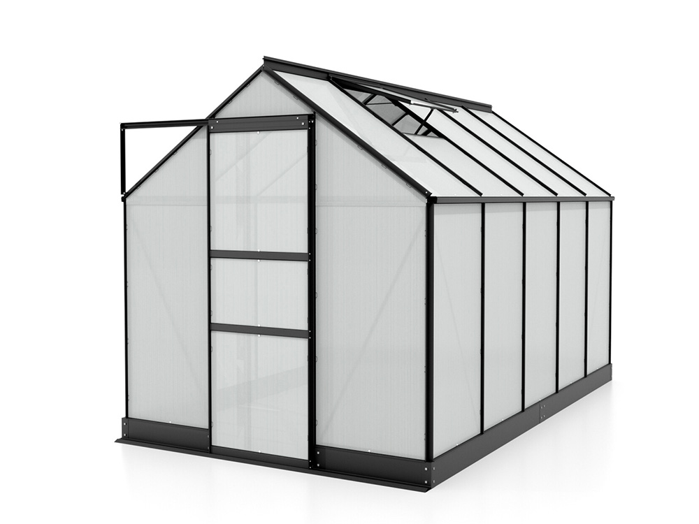 Het stevige frame is vervaardigd uit zwart poedergecoat aluminium, wat zorgt voor een luxueuze uitstraling. De schuifdeur, met een breedte van 61 cm, kan zo worden gemonteerd dat ze zowel naar links als naar rechts kan openen. Daarnaast is de kas uitgerust met geïntegreerde dakgoten en een fundering die zorgt voor een solide en stabiele verbinding met het frame.