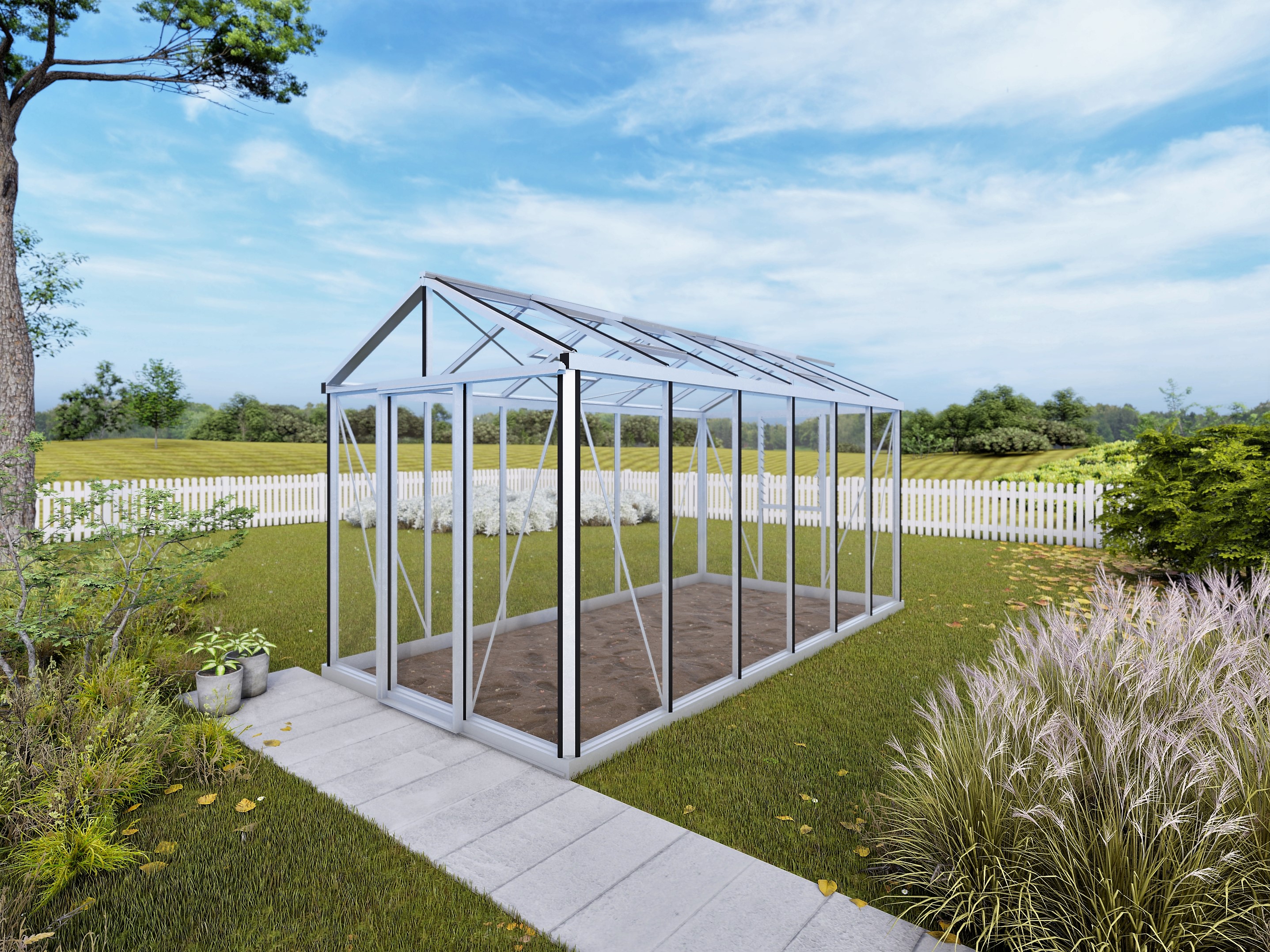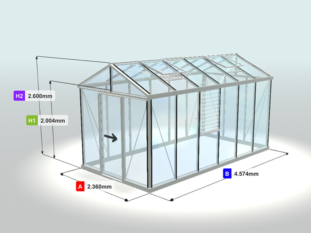 Deze premium serre (nokhoogte 260 cm) is standaard uitgerust met 1 schuifdeur, 3 dakramen en 1 louvre-zijraam. De breedte-diepte verhouding van deze serre is 3 x 5 ruiten. Dit model Helios Master heeft een werkoppervlakte van ca. 10,8 m² en wordt standaard geleverd in een blank aluminium frame.