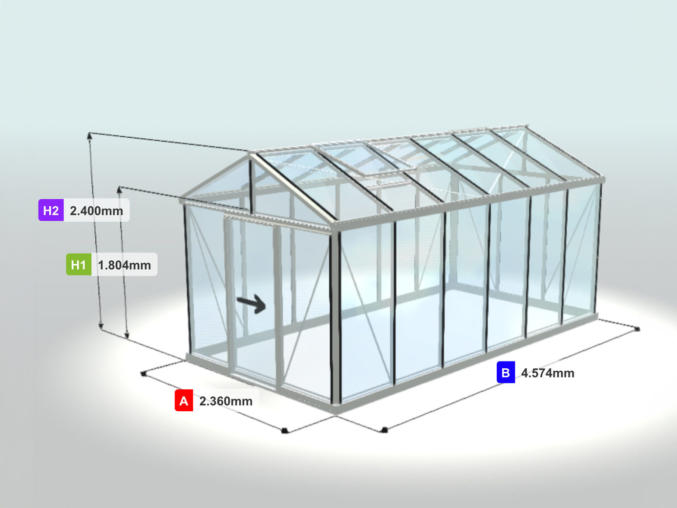 Dit model heeft een afmeting van 236 x 458 cm waardoor je een werkoppervlakte van bijna 11 m² tot je beschikking hebt. De breedte-diepte verhouding van 3 x 6 ruiten zorgt voor een ruime en praktische indeling.